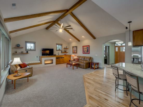 The family room is adorned with exposed arched beams, contemporary fireplace with granite front, storage and bench seating